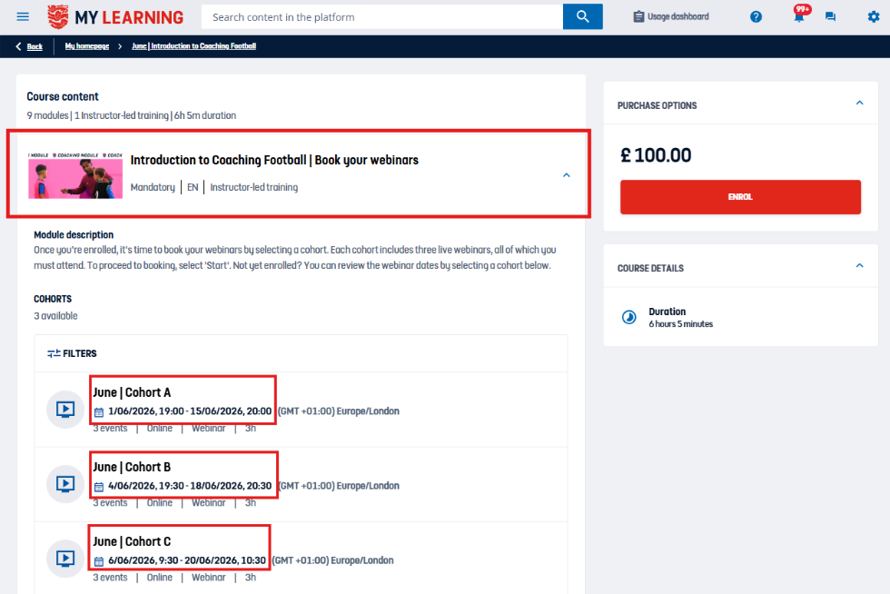 Your first required action after enrolment is to book onto your chosen cohort. Booking a cohort secures your place on your preferred webinar dates and ensures you can attend your preferred sessions.